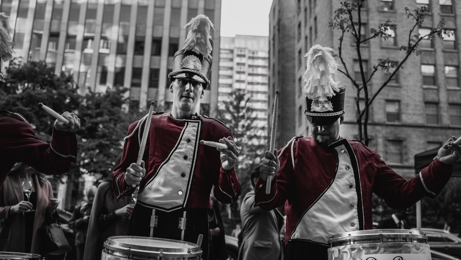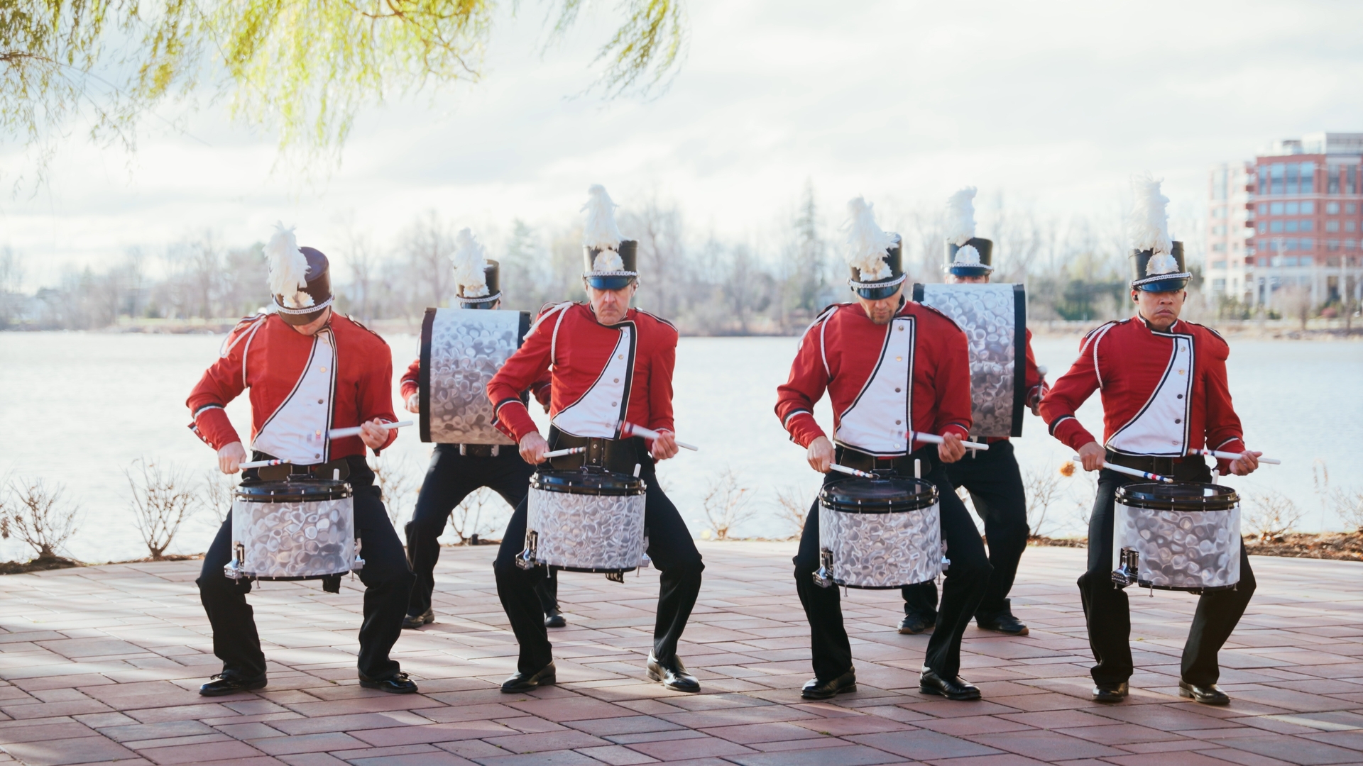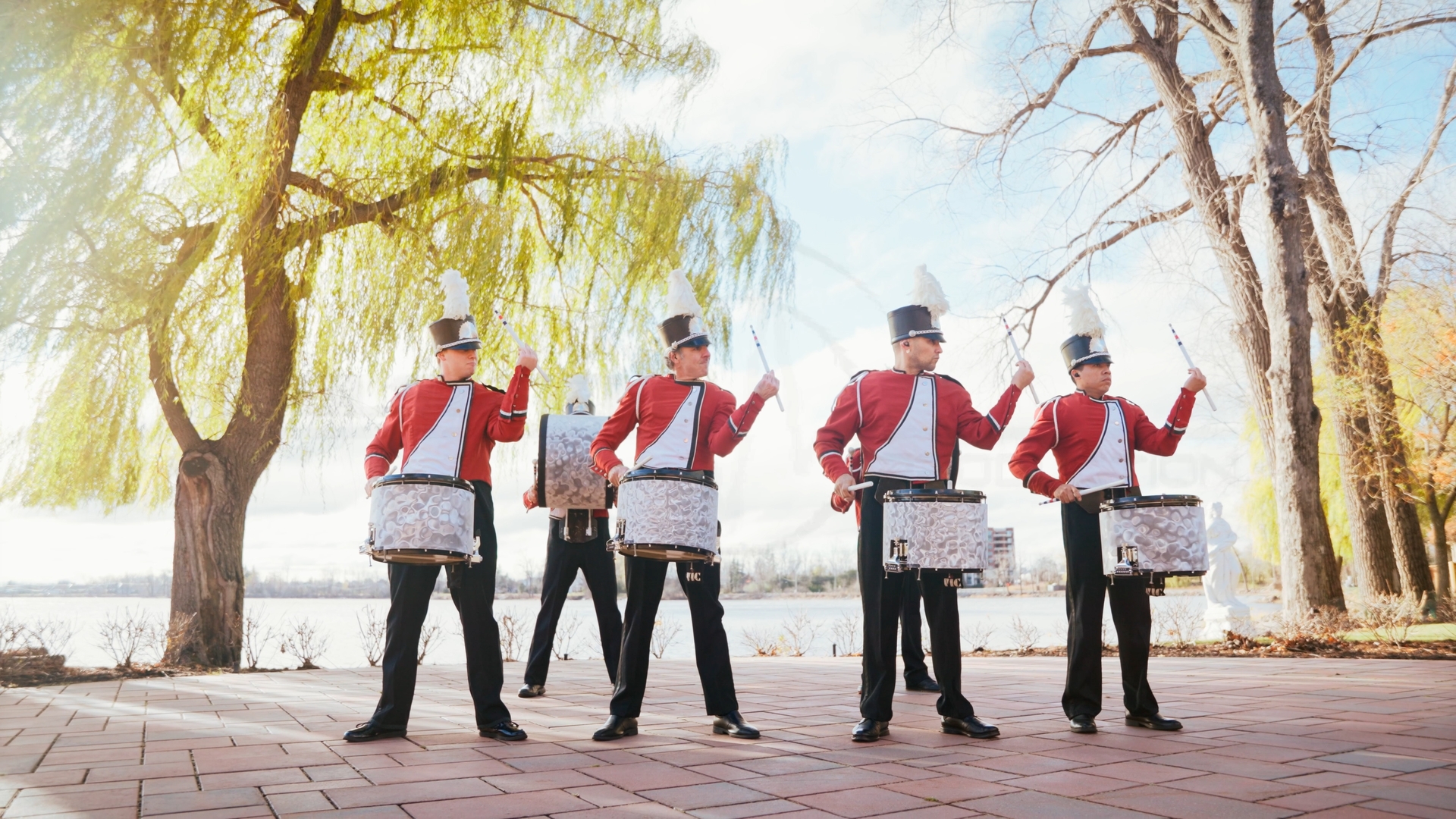 - Up to 10 drummers in classic red drum corps uniforms with shakos