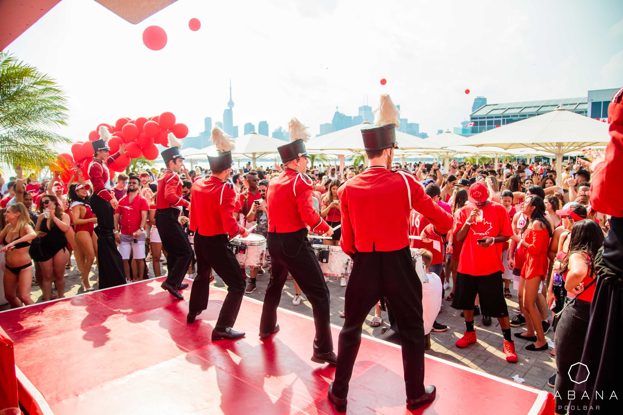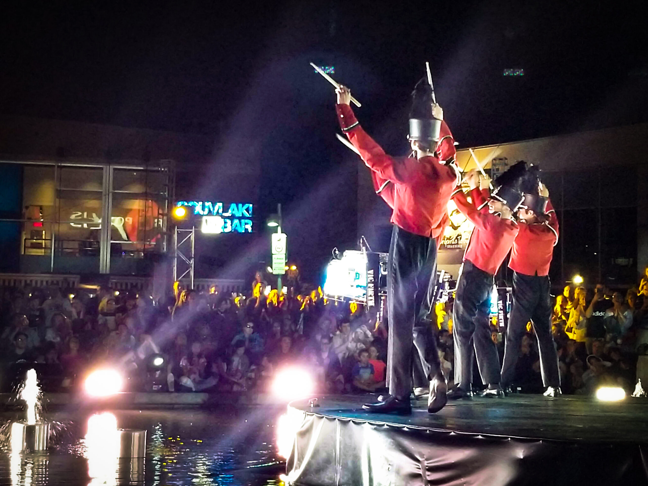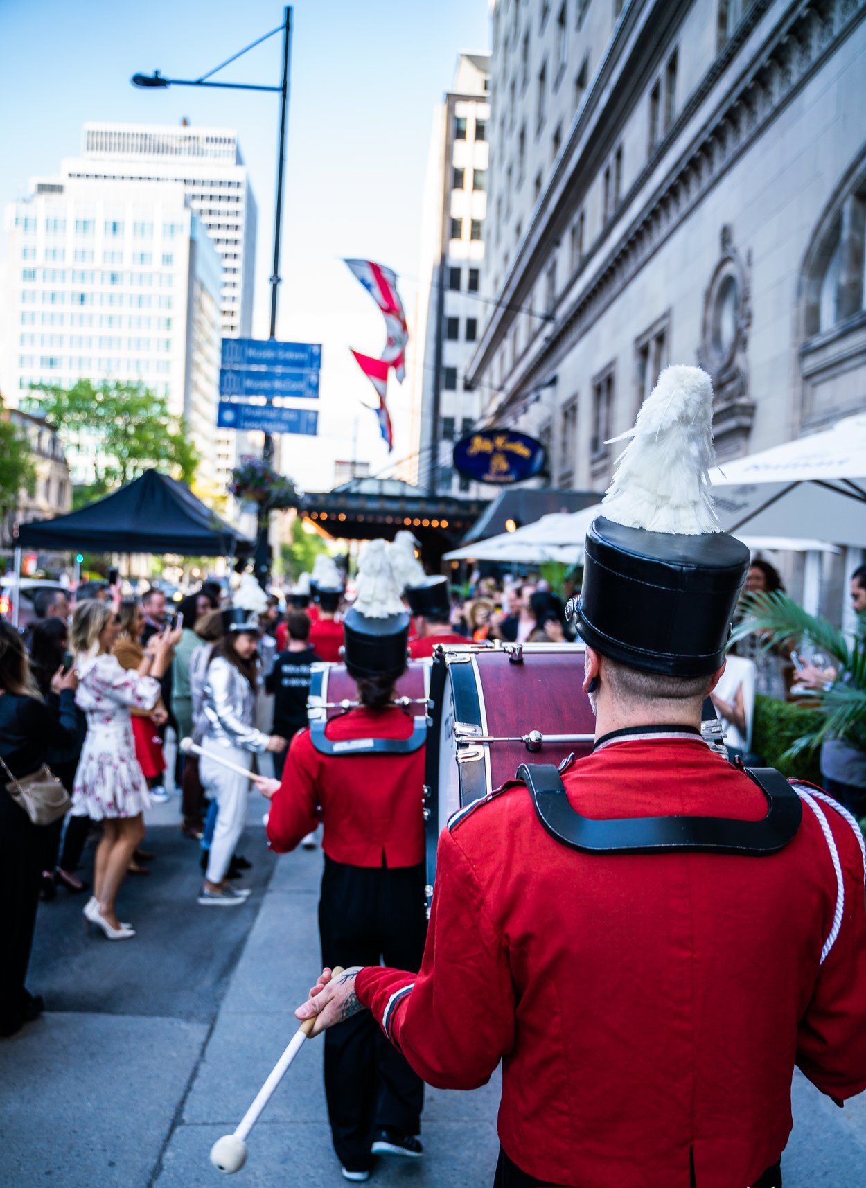- Up to 10 drummers in classic red drum corps uniforms with shakos