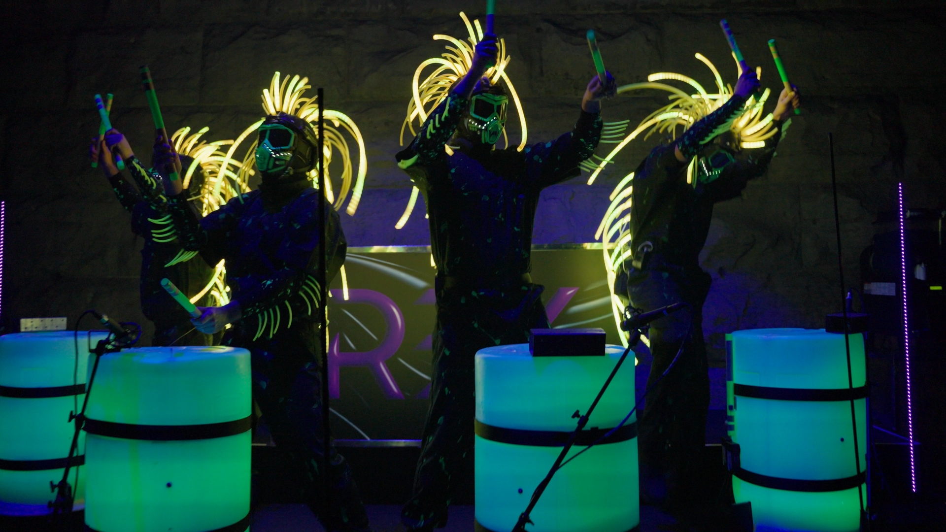 In a world transformed by light and mutation, Radiant Mutation takes audiences on a journey into the extraordinary. Each performer wears a fully programmable UV/LED costume, glowing in patterns and colors that pulse with the beat. Their presence is both mesmerizing and slightly otherworldly, like a tribe of post-apocalyptic creatures who discovered rhythm as their universal language.