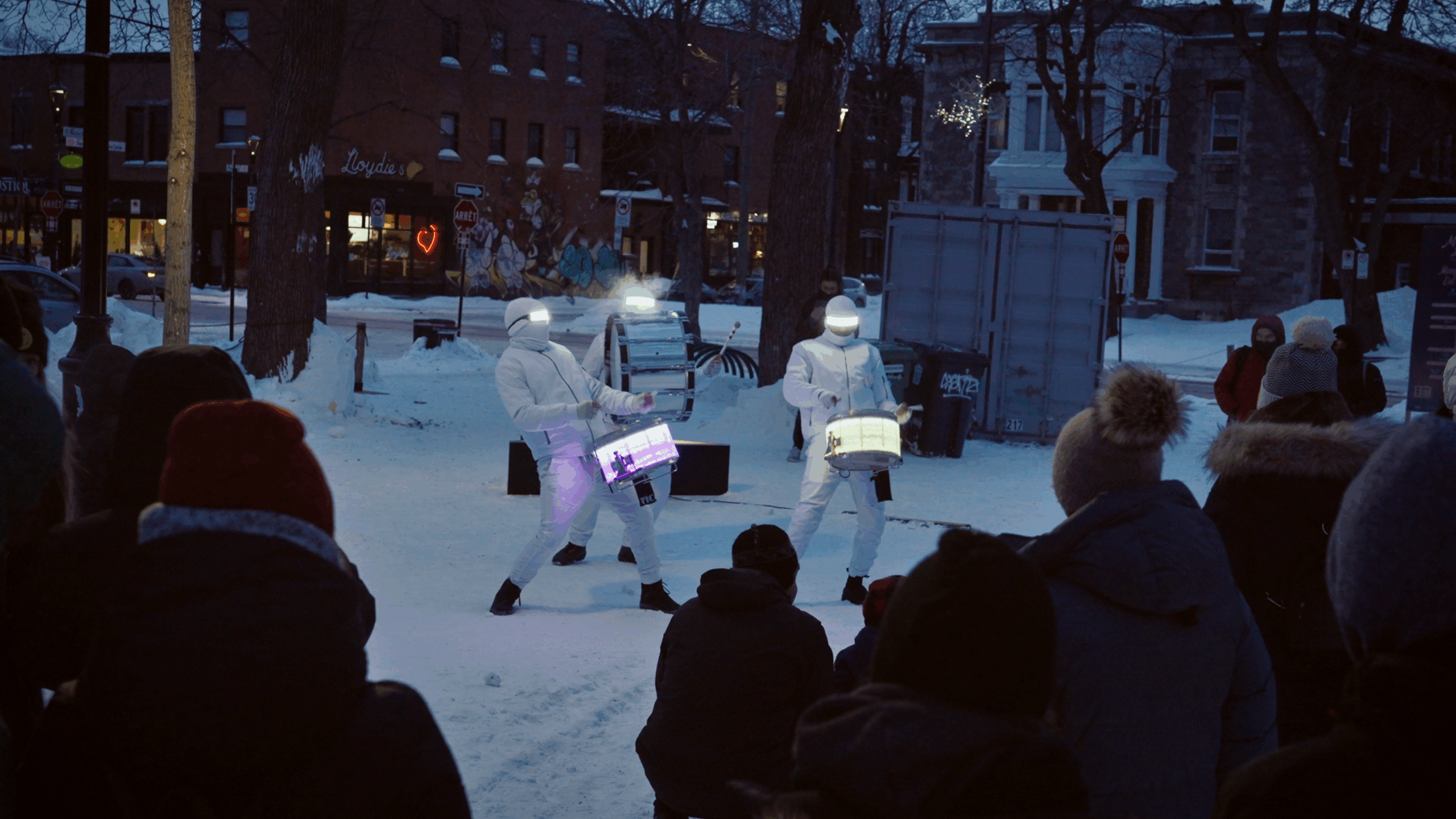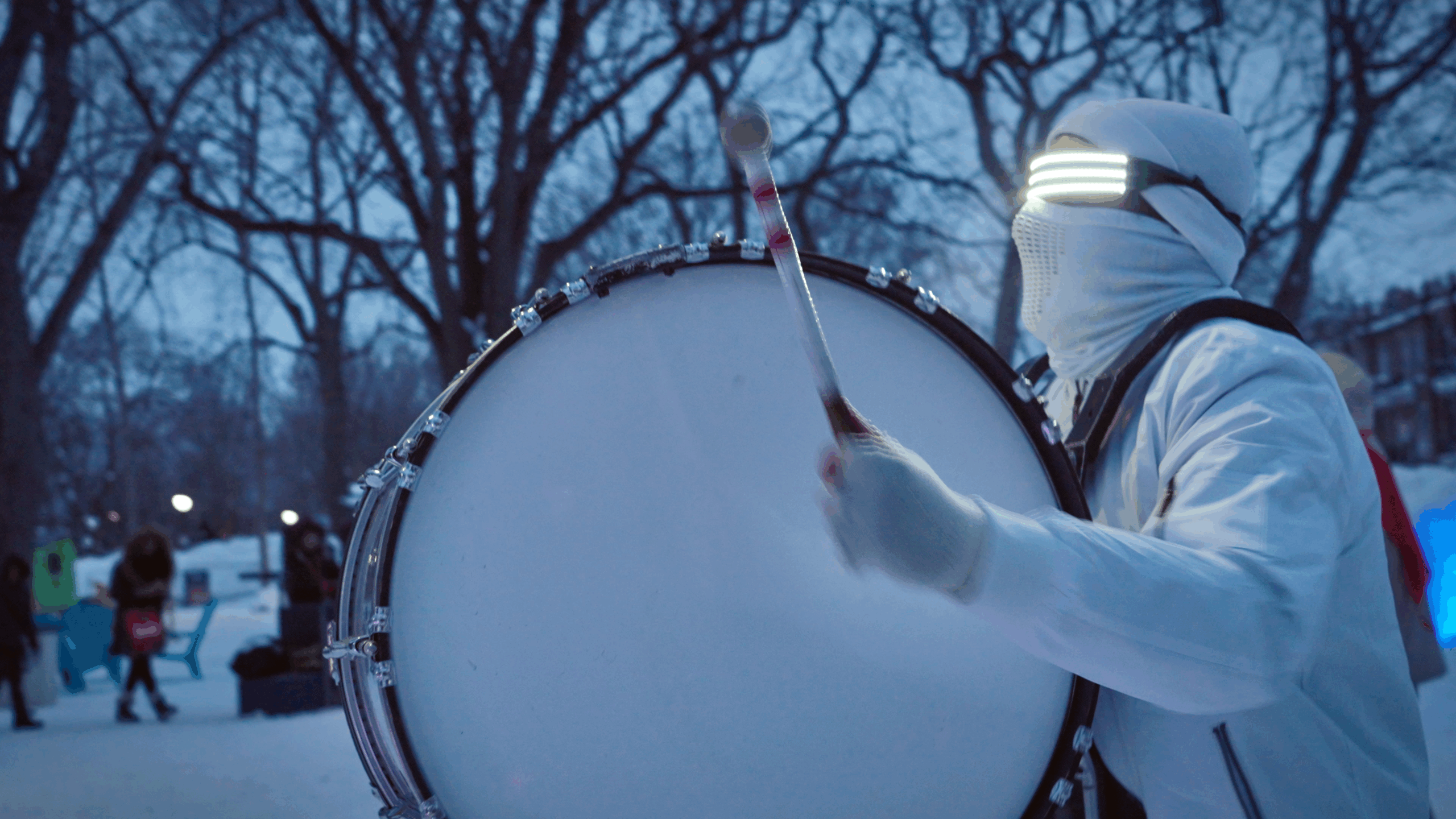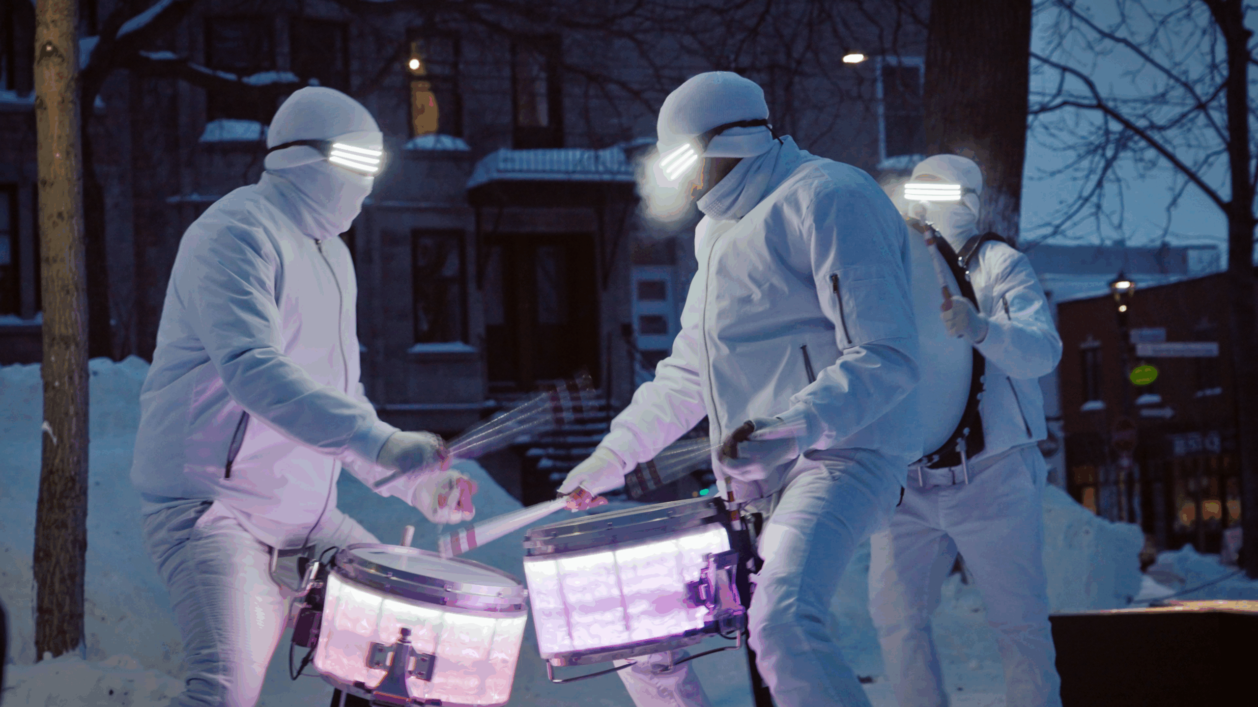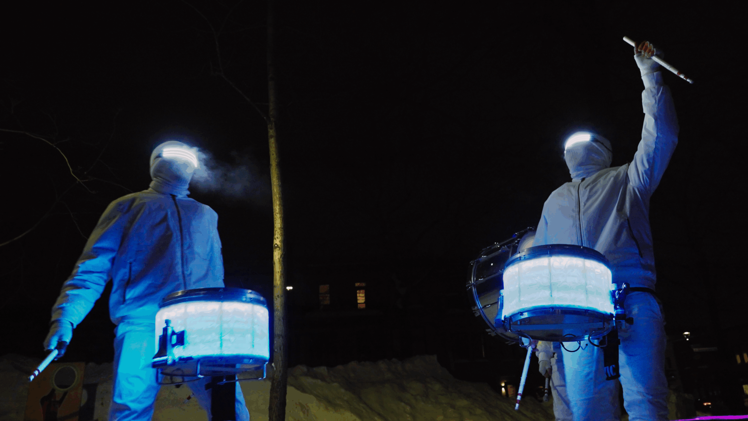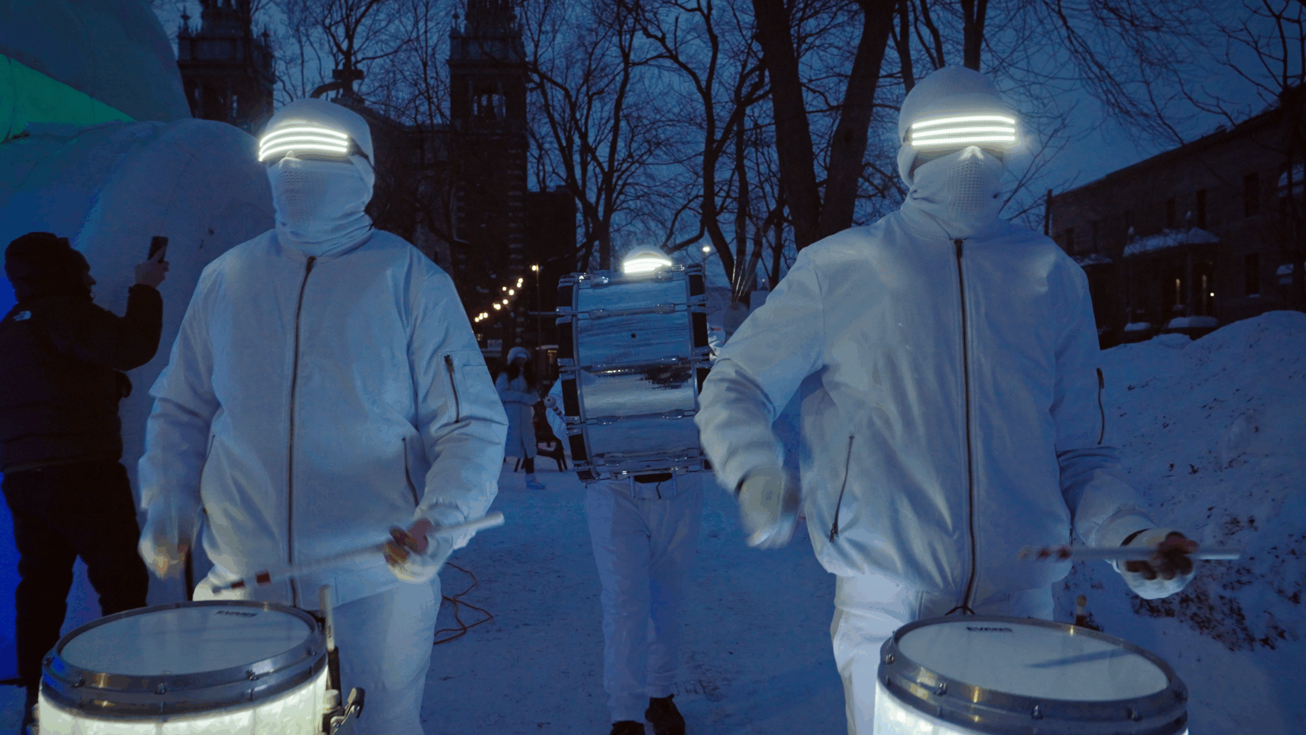 White winter gear, LED drums, and unstoppable energy; bringing heat and light to the coldest events.